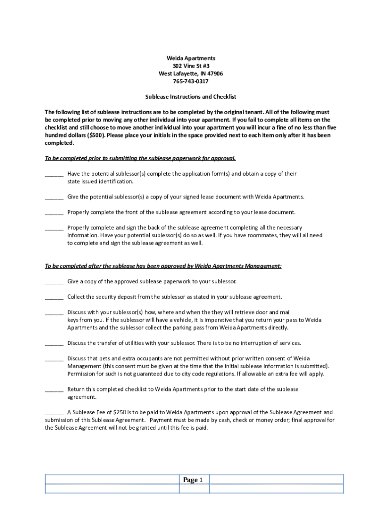 Wade Apartments 302 Vine St #3 West Lafayette, IN 47906 7657430317 Sublease Instructions and Checklist The following list of sublease instructions are to be completed by the original tenant. All the