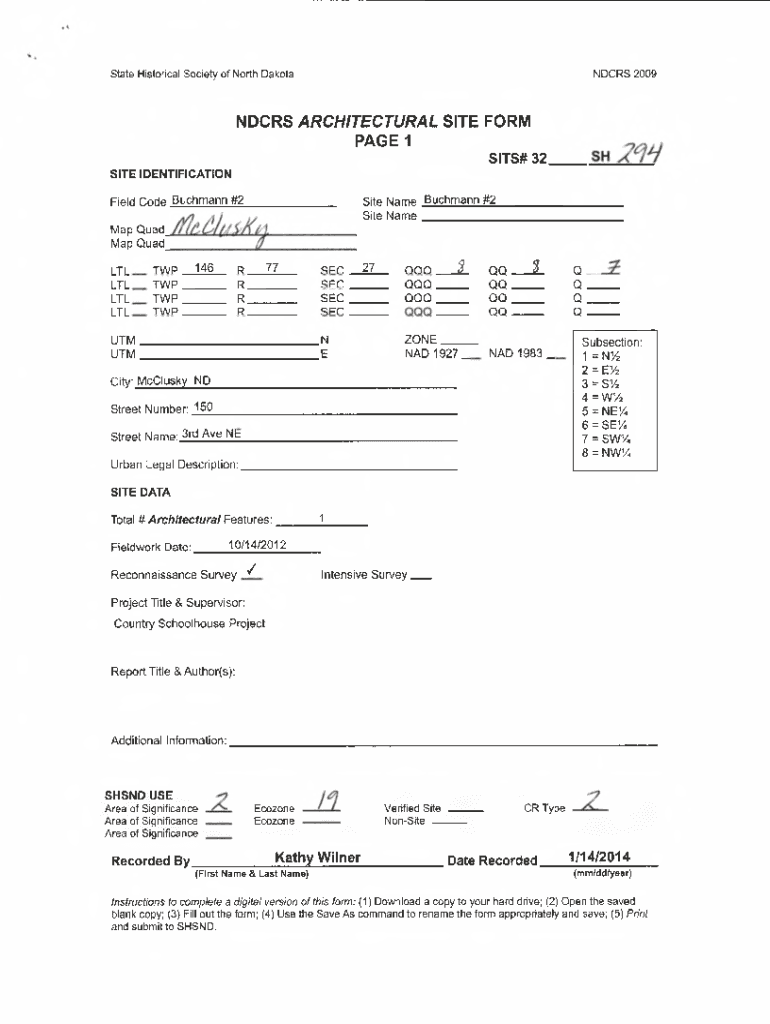 .,State Historical Society of North DakotaNDCRS 2009NDCRS ARCHITECTURAL SITE FORM