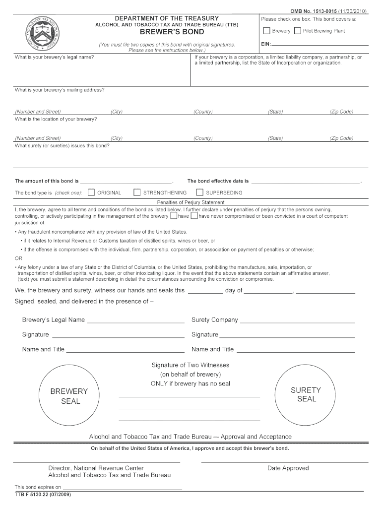 DEPARTMENT OF THE TREASURY ALCOHOL AND TOBACCO TAX AND TRADE BUREAU (TT) BREWER S BOND OMB No. 1513-0015 (11/30/2010) Please check one box. This bond covers a: Brewery Pilot Brewing Plant EIN: (You