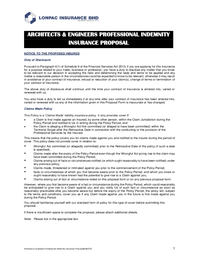 ARCHITECTS & ENGINEERS PROFESSIONAL INDEMNITY INSURANCE PROPOSAL NOTICE TO THE PROPOSED INSURED Duty of Disclosure Pursuant to Paragraph 4(1) of Schedule 9 of the Financial Services Act 2013, if you