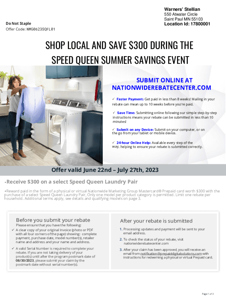 Warner's\' Stellar 550 At water Circle Saint Paul MN 55103Do Not StapleLocation I'd: 17800001Oer Code: NMG0623SQFL01SHOP LOCAL AND SAVE $300 DURING THE SPEED QUEEN SUMMER SAVINGS EVENTSUBMIT ONLINE