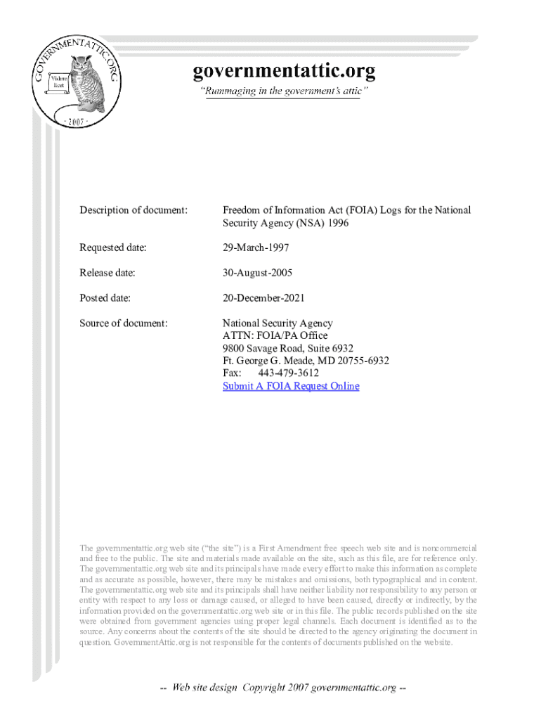 Description of document:Freedom of Information Act (FOIA) Logs for the National Security Agency (NSA) 1996Requested date:29March1997Release date:30August2005Posted date:20December2021Source of document:National