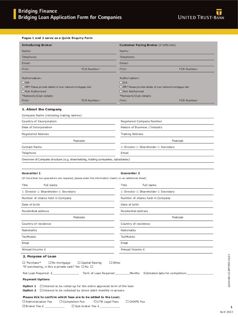 Bridging Finance Bridging Loan Application Form for CompaniesPages and 2 serve as a Quick Inquiry Form Introducing BrokerCustomer Facing Broker (if different)Name:Name:Telephone:Telephone:Email:Email:Firm:FCA