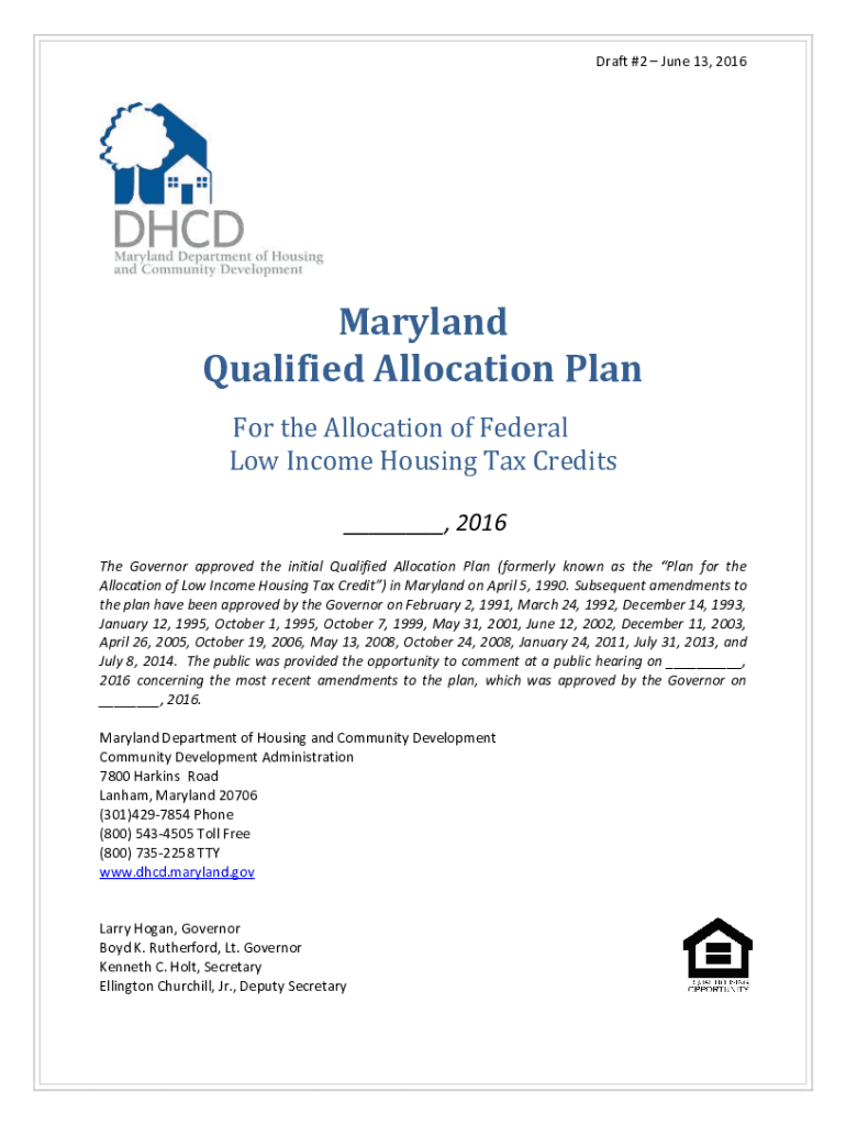 Draft #2 June 13, 2016Maryland Qualified Allocation Plan For the Allocation of Federal Low Income Housing Tax Credits ___, 2016 The Governor approved the initial Qualified Allocation Plan (formerly