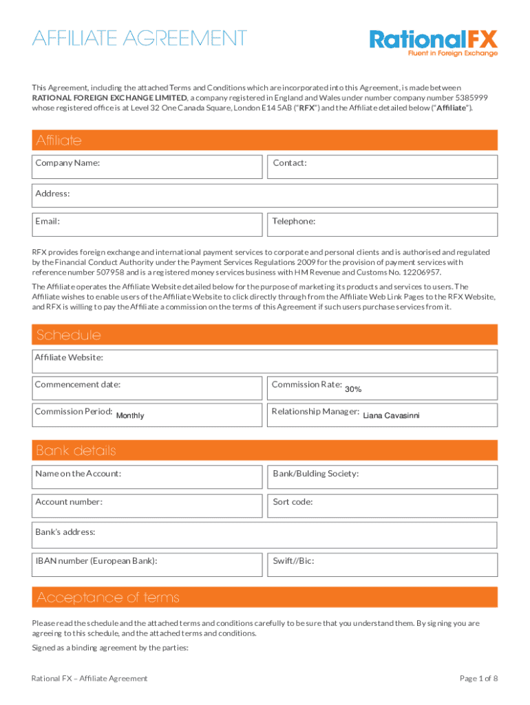 AFFILIATE AGREEMENT This Agreement, including the attached Terms and Conditions which are incorporated into this Agreement, is made between RATIONAL FOREIGN EXCHANGE LIMITED, a company registered