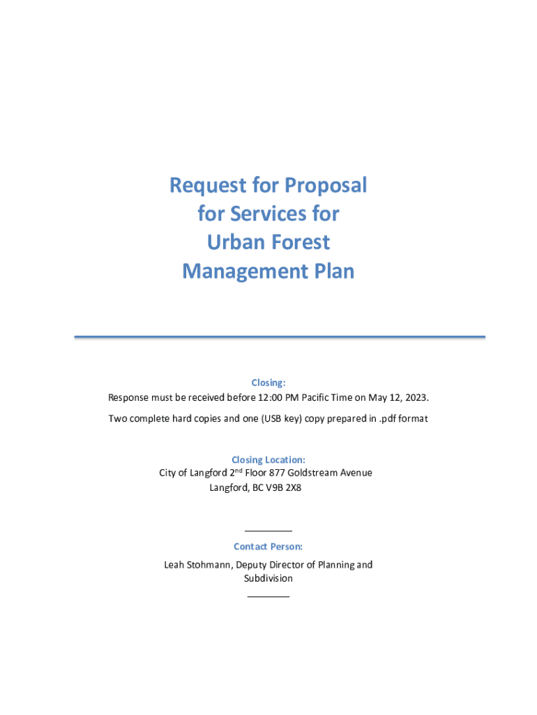 Request for Proposal for Services for Urban Forest Management Enclosing: Response must be received before 12:00 PM Pacific Time on May 12, 2023. Two complete hard copies and one (USB key) copy prepared