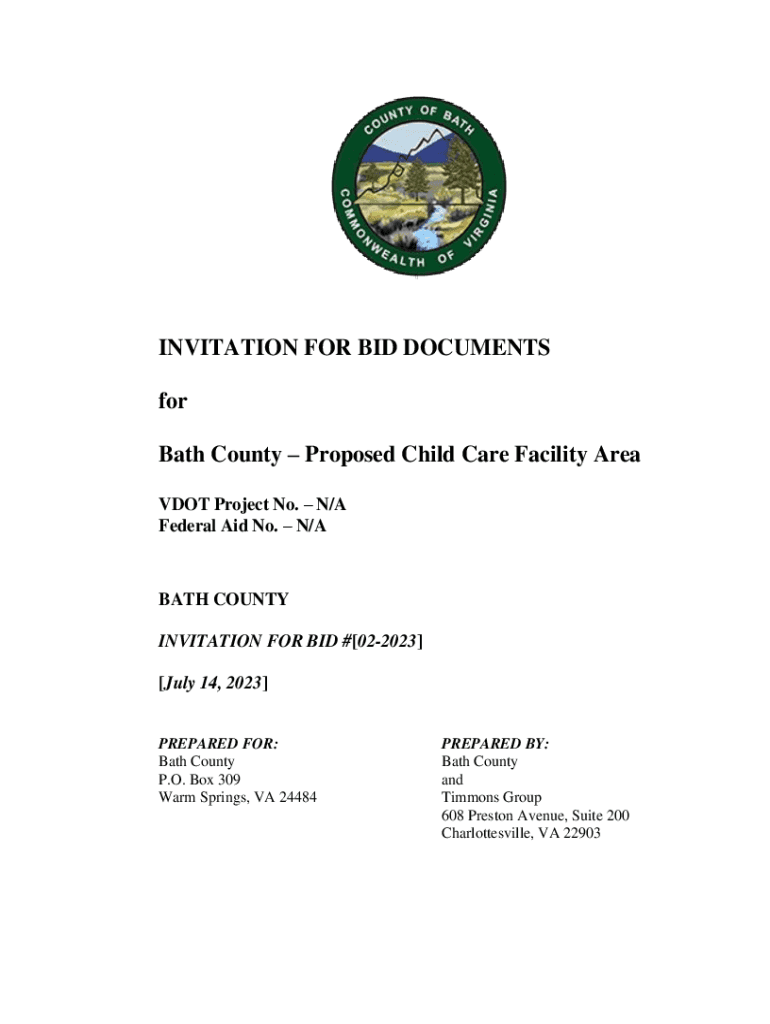 INVITATION FOR BID DOCUMENTS for Bath County Proposed Child Care Facility Area DOT Project No. N/A Federal Aid No. N/BATH COUNTY INVITATION FOR BID #[022023] [July 14, 2023] PREPARED FOR: Bath County