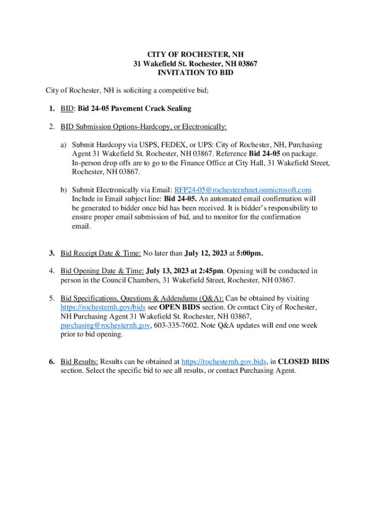 CITY OF ROCHESTER, NH 31 Wakefield St. Rochester, NH 03867 INVITATION TO BID City of Rochester, NH is soliciting a competitive bid; 1. BID: Bid 2405 Pavement Crack Sealing 2. BID Submission OptionsHardcopy,