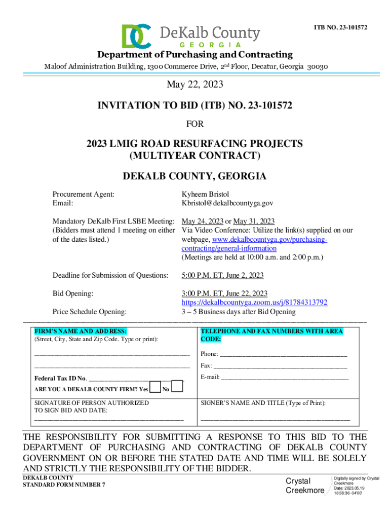 ITB NO. 23101572Department of Purchasing and Contracting Aloof Administration Building, 1300 Commerce Drive, 2nd Floor, Decatur, Georgia 30030May 22, 2023 INVITATION TO BID (ITB) NO. 23101572 FOR2023