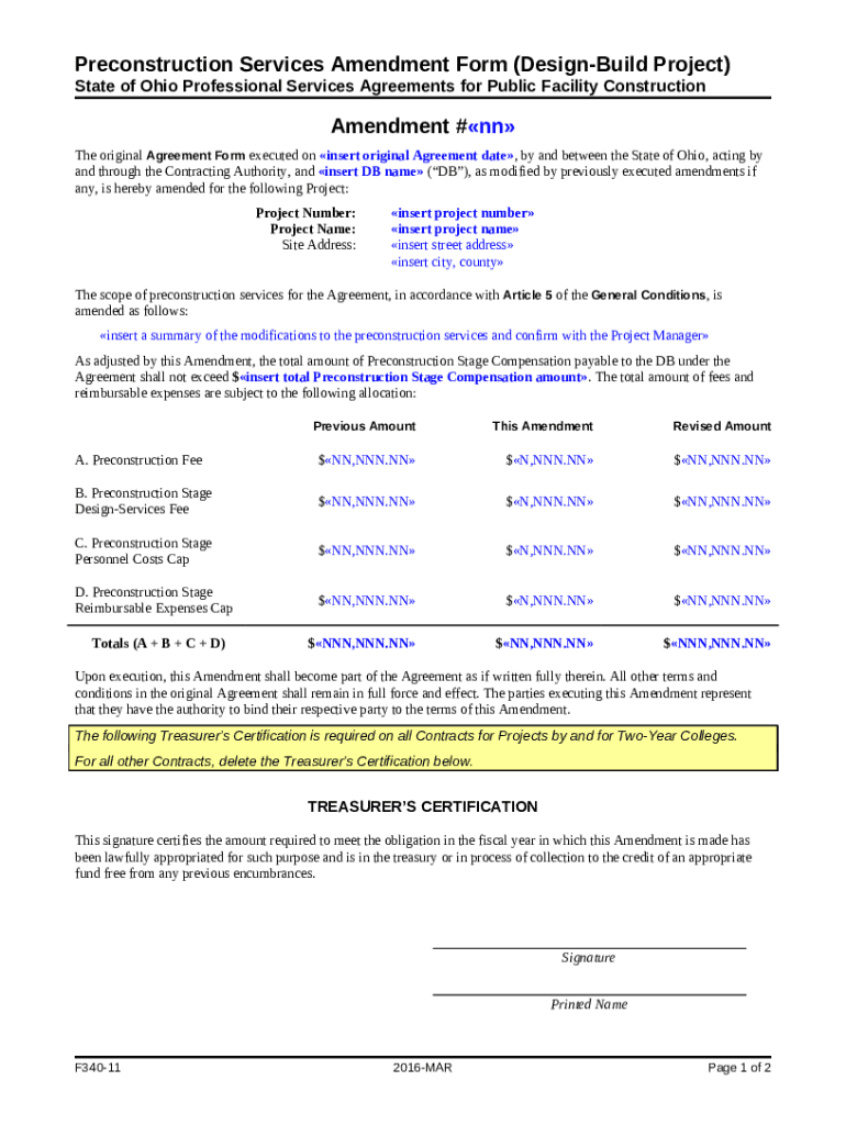What is F340-11. Preconstruction Services Amendment (Design-Build Project) Form?