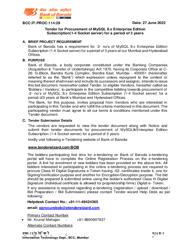 Date: 27 June 2022BCC:IT:PRO:114:29Tender for Procurement of MySQL 8.x Enterprise Edition Subscription(14 Socket server) for a period of 3 years A. BRIEF PROJECT REQUIREMENTBank of Baroda has a requirement