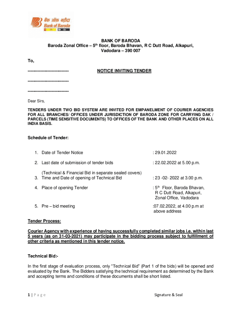 BANK OF BARODA Zonal Office 5th floor, Baroda Haven, R C Duty Road, Alkali, Vadodara 390 007 To, NOTICE INVITING Tenderer Sirs, TENDERS UNDER TWO BID SYSTEM ARE INVITED FOR EMBANKMENT OF COURIER AGENCIES