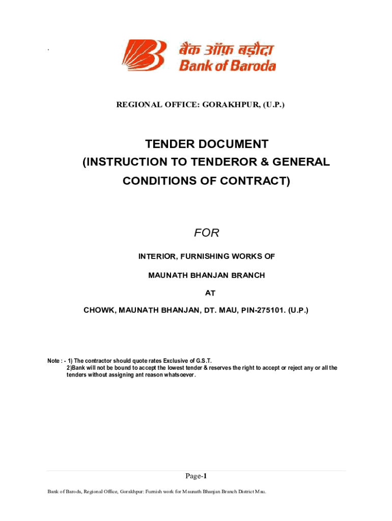 .REGIONAL OFFICE: GORAKHPUR, (U.P.)TENDER DOCUMENT (INSTRUCTION TO TENDERER & GENERAL CONDITIONS OF CONTRACT)FOR INTERIOR, FURNISHING WORKS OF MAGNATE BANYAN BRANCH AT CHOW, MAGNATE BANYAN, DT. MAU,