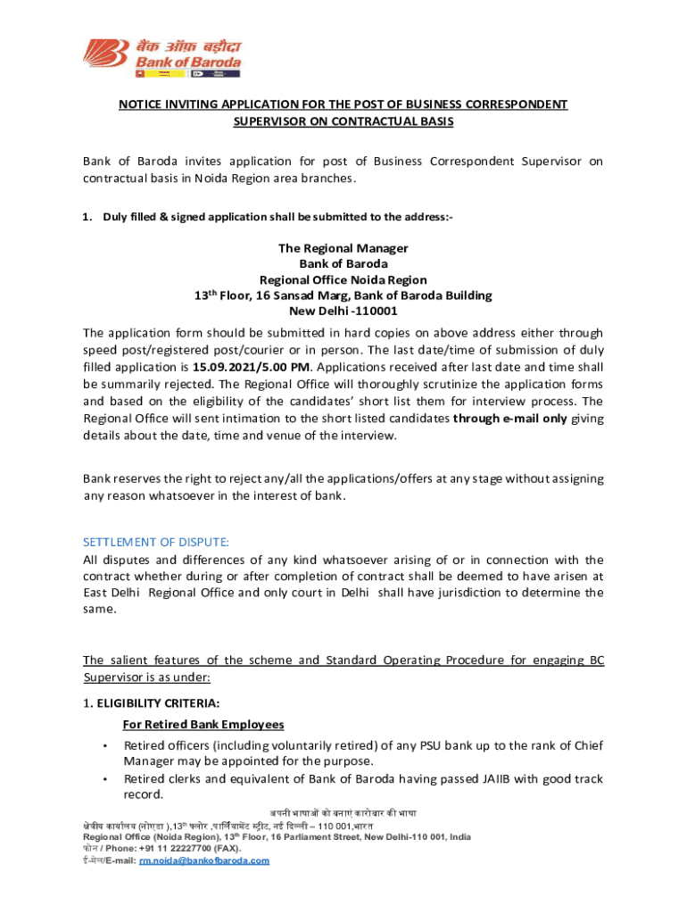 NOTICE INVITING APPLICATION FOR THE POST OF BUSINESS CORRESPONDENT SUPERVISOR ON CONTRACTUAL BASIS Bank of Baroda invites application for post of Business Correspondent Supervisor on contractual basis