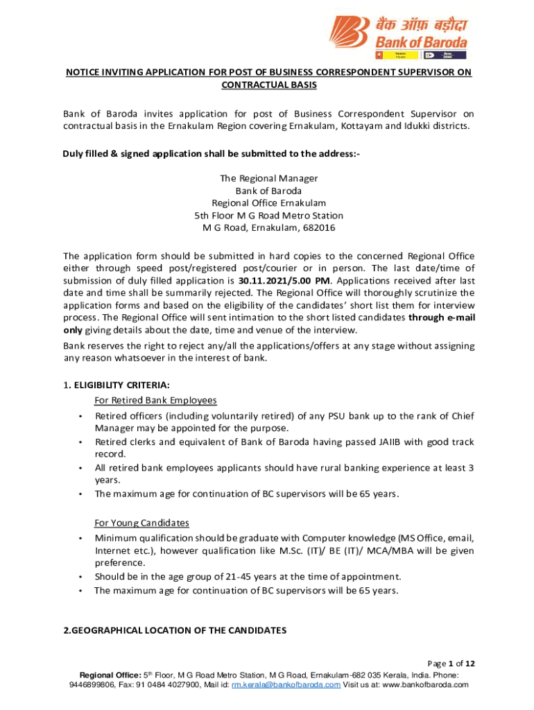 Bank of Baroda invites application for post of Business Correspondent Supervisor on