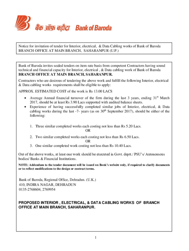 Notice for invitation of tender for Interior, electrical, & Data Cabling works of Bank of Baroda BRANCH OFFICE AT MAIN BRANCH, SAHARANPUR (U.P.) Bank of Baroda invites sealed tenders on item rate