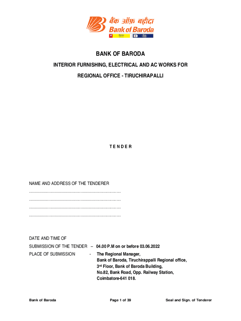 BANK OF BARODA INTERIOR FURNISHING, ELECTRICAL AND AC WORKS FOR REGIONAL OFFICE TIRUCHIRAPALLITENDERNAME AND ADDRESS OF THE TENDERER DATE AND TIME OF SUBMISSION OF THE TENDER 04.00 P. M on or before