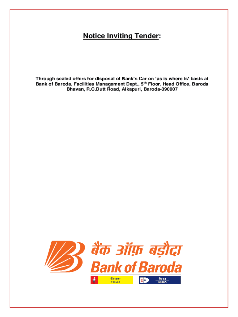Notice Inviting Tender:Through sealed offers for disposal of Banks Car on as is where is basis at Bank of Baroda, Facilities Management Dept., 5th Floor, Head Office, Baroda Haven, R.C. Dutt Road,