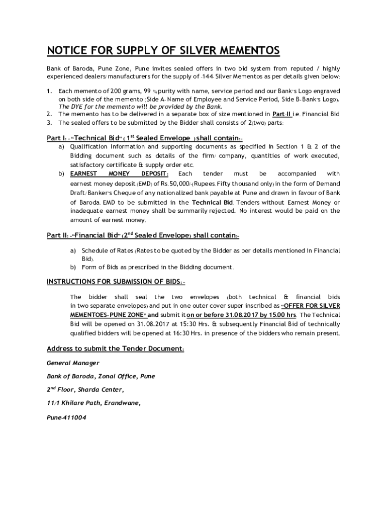 NOTICE FOR SUPPLY OF SILVER MEMENTOS Bank of Baroda, Pune Zone, Pune invites sealed offers in two bid system from reputed / highly experienced dealers/ manufacturers for the supply of 144 Silver Mementos