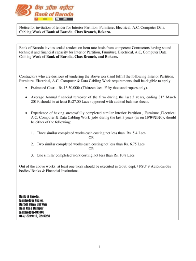 Notice for invitation of tender for Interior Partition, Furniture, Electrical, A. C, Computer Data, Cabling Work of Bank of Baroda, Has Branch, Board. Bank of Baroda invites sealed tenders on item