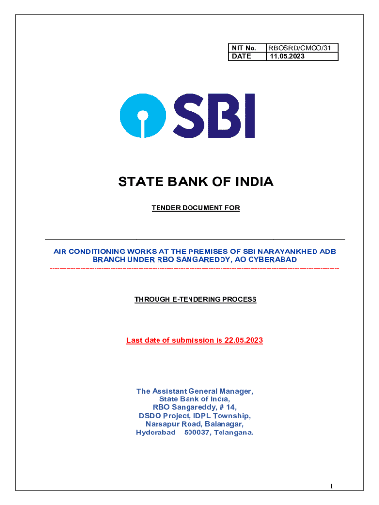 NIT No. WATERBOARD/MCO/31 11 11.05.2023STATE BANK OF INDIA TENDER DOCUMENT FORA IR CONDITIONING WORK WORKS AT THE PREMISES OF SBI NARAYANKHED ADB BRANCH UNDER HBO SANGAREDDY, AO HYDERABAD THROUGH