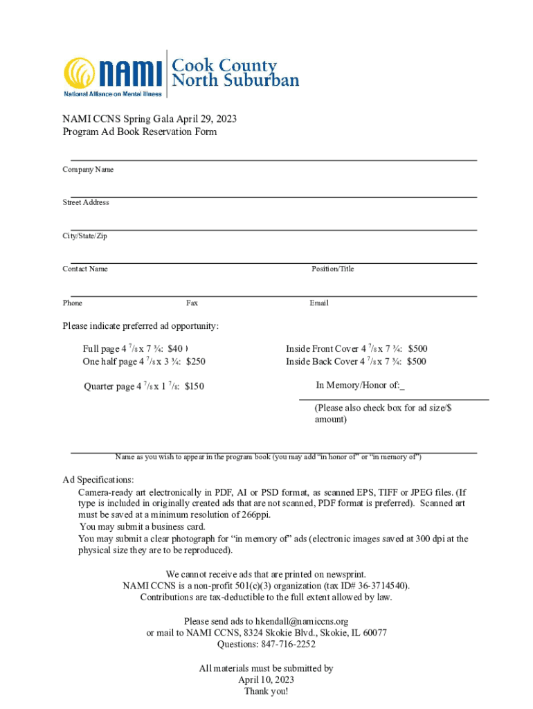 Program Ad Book Reservation FormCompany Backstreet Addressing/State/Contact NamePhonePosition/TitleFaxEmailPlease indicate preferred ad opportunity: