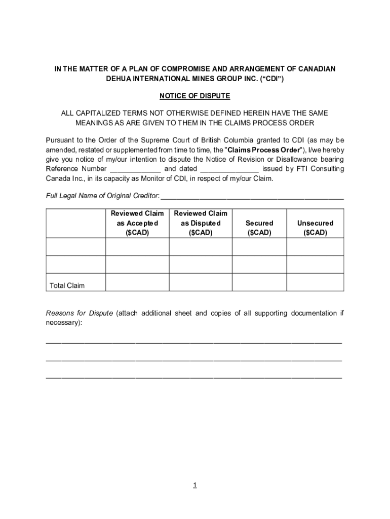 IN THE MATTER OF A PLAN OF COMPROMISE AND ARRANGEMENT OF CANADIAN DEBUT INTERNATIONAL MINES GROUP INC. (CDI) NOTICE OF DISPUTE ALL CAPITALIZED TERMS NOT OTHERWISE DEFINED HEREIN HAVE THE SAME MEANINGS
