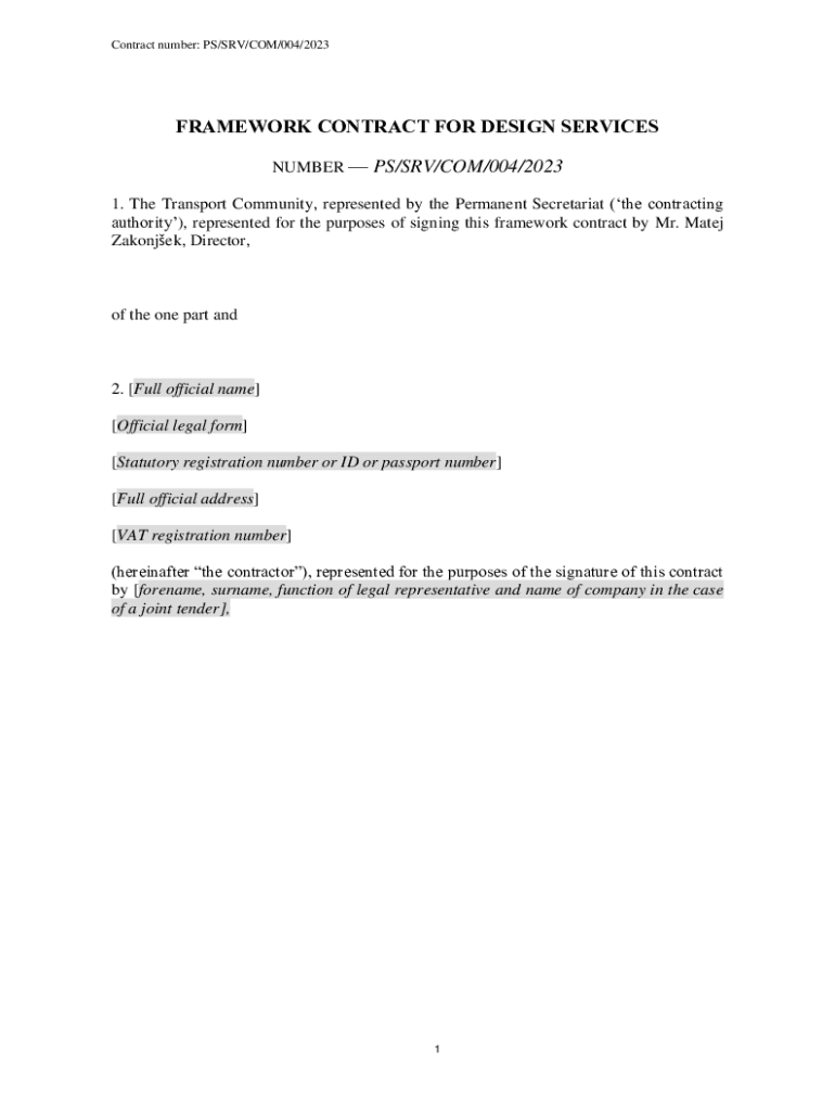 Contract number: PS/SRV/COM/004/2023FRAMEWORK CONTRACT FOR DESIGN SERVICES NUMBER PS/SRV/COM/004/2023 1. The Transport Community, represented by the Permanent Secretariat (the contracting authority),