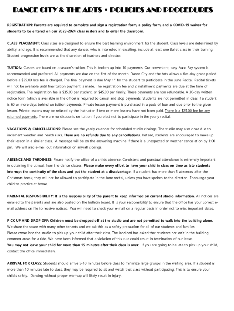 DANCE CITY & THE ARTS POLICIES AND PROCEDURES REGISTRATION: Parents are required to complete and sign a registration form, a policy form, and a COVID-19 waiver for students to be entered on our 20232024