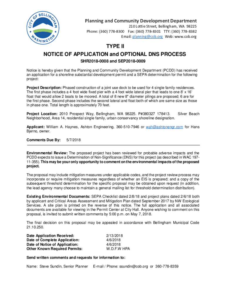 Planning and Community Development Department 210 Lottie Street, Bellingham, WA 98225 Phone: (360) 7788300 Fax: (360) 7788301 TTY: (360) 7788382 Email: planning@cob.org Web: www.cob.orgTYPE II NOTICE