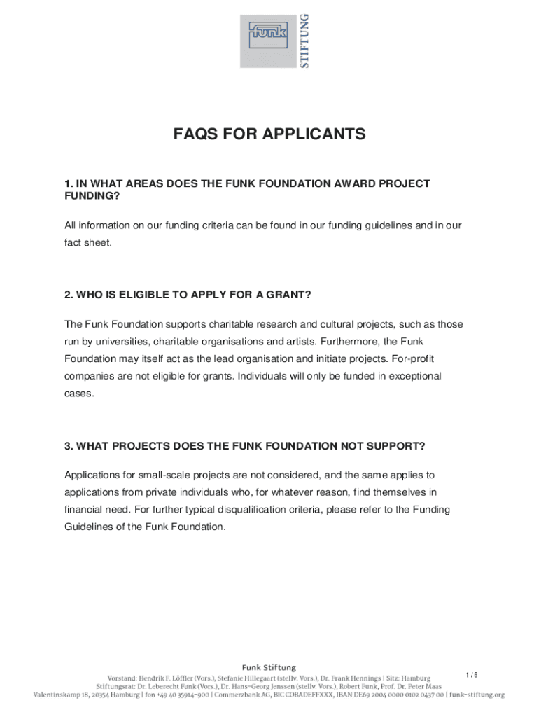 FAQs FOR APPLICANTS 1. IN WHAT AREAS Do THE FUNK FOUNDATION AWARD PROJECT FUNDING? All information on our funding criteria can be found in our funding guidelines and in our fact sheet.2. WHO IS ELIGIBLE