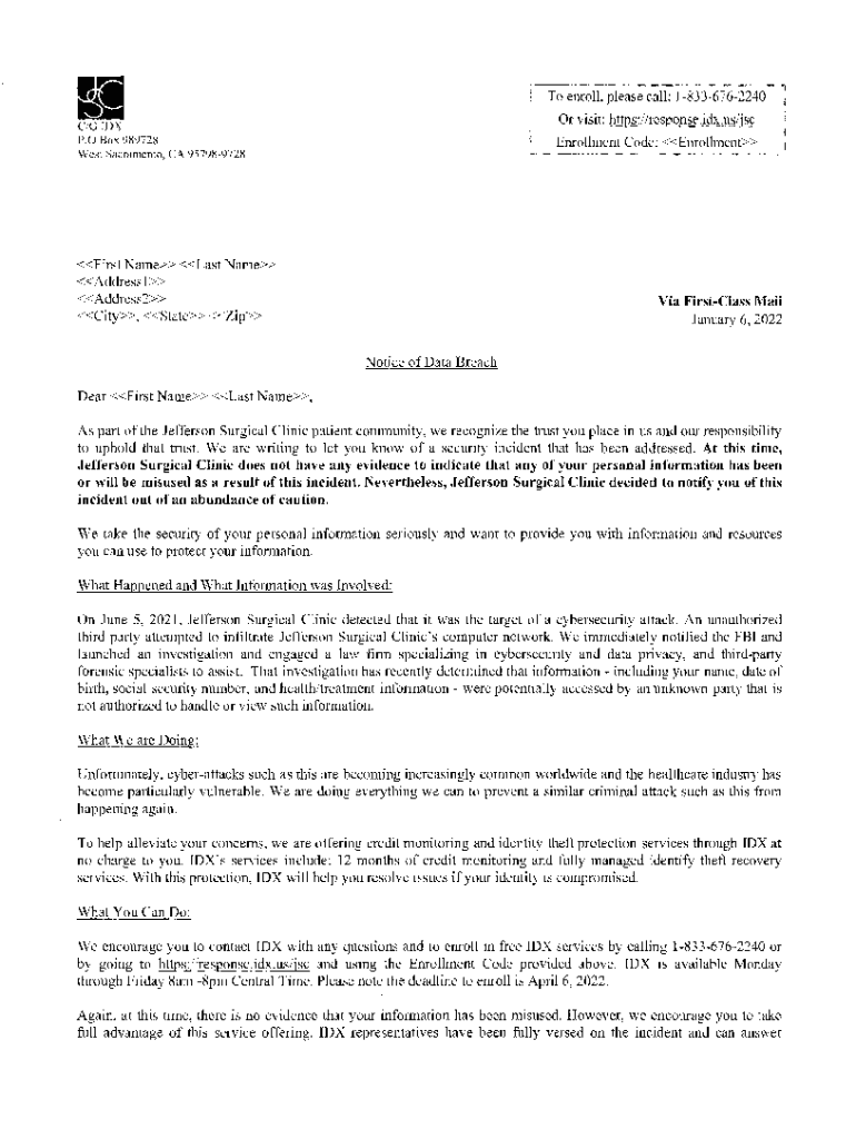 To enroll, please call: 18336762240 Or visit: https://response.idx.us/jscC/0 ID P. O Box 989728 West Sacramento, CA 957989728Enrollment Code: EnrollmentFirst Name Last Name Address l Address2 City,