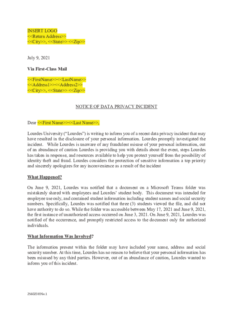INSERT LOGO Return Address City, State Zip July 9, 2021, Via First-class Mail FirstNameLastName Address1Address2 City, State Zip NOTICE OF DATA PRIVACY INCIDENT Dear First Nameless Name, Lourdes University