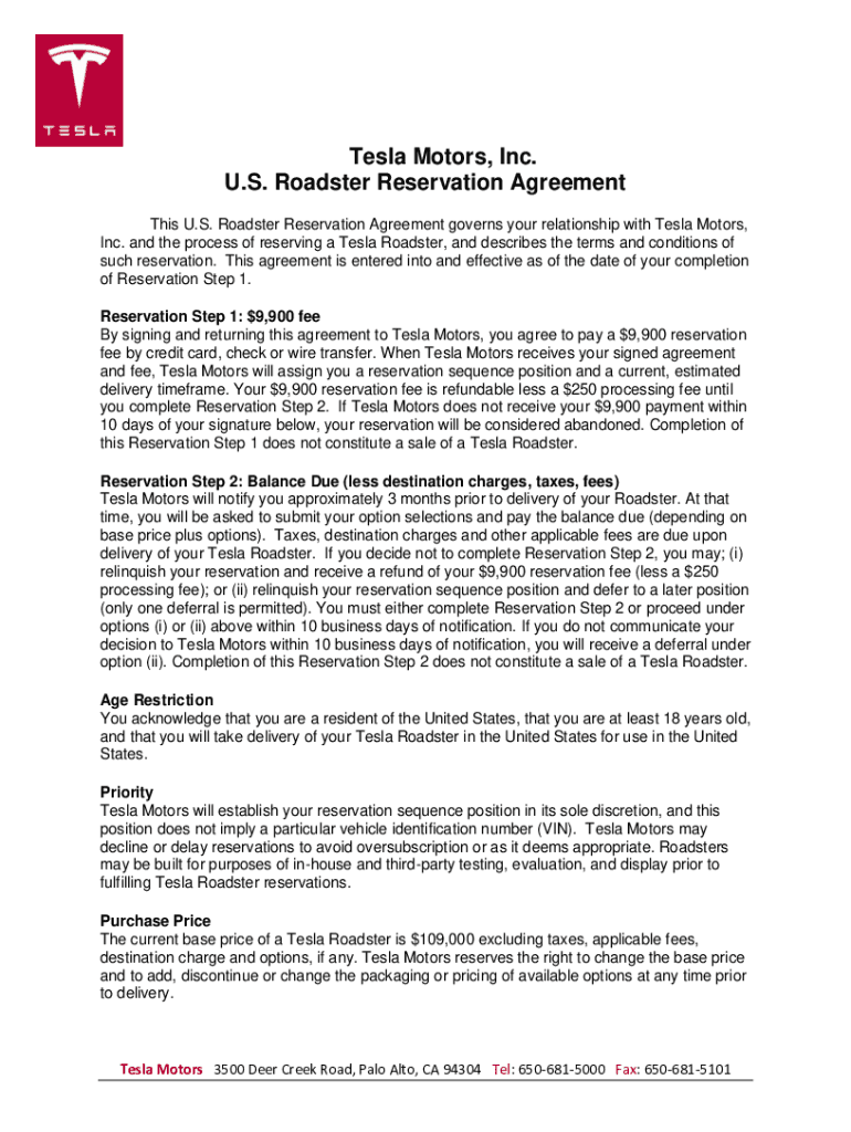 Get the free Tesla Motors, Inc. US Roadster Reservation Agreement