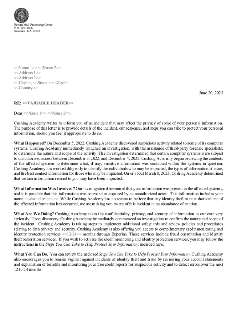 Return Mail Processing Center P.O. Box 3826 Suwanee, GA 30024Name 1 Name 2 Address 1 Address 2 City, State Zip Country June 20, 2023, RE: VARIABLE HEADER Dear Name 1 Name 2: Cushing Academy writes
