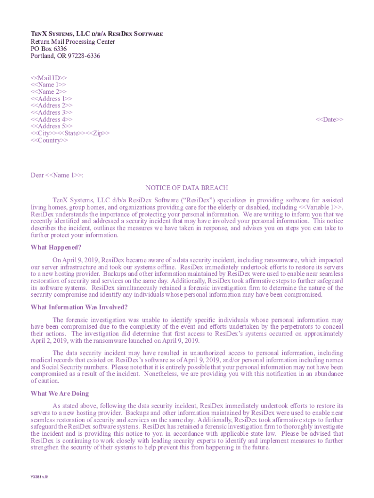 Get the free NOTICE OF DATA BREACH TenX Systems, LLC d/b/a ...
