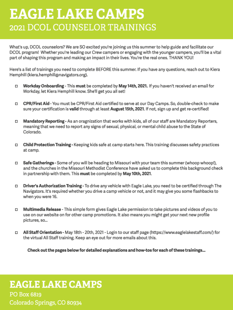 EAGLE LAKE CAM PS 2021 COL COUNSELOR TRAIN N I NGS What \'s up, COL counselors? We are SO excited you\'re joining us t his summer to help guide and facilitate our COL program! Whet her you\'re leading
