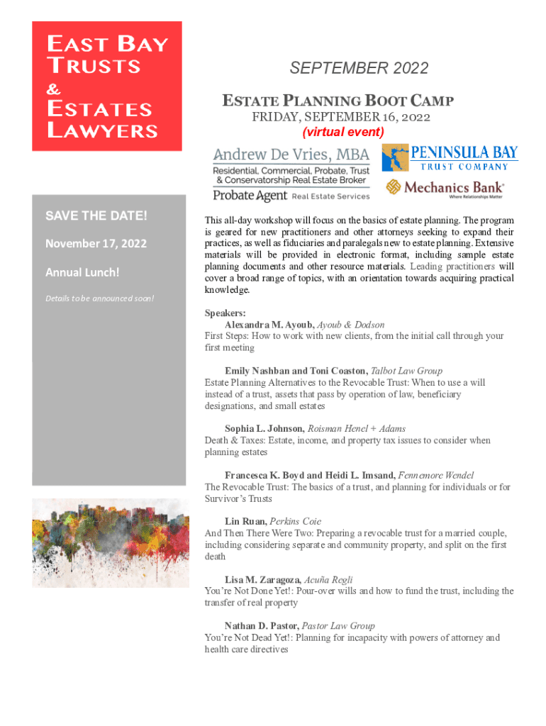 SEPTEMBER 2022 ESTATE PLANNING BOOT CAMP FRIDAY, SEPTEMBER 16, 2022 (virtual event)SAVE THE DATE! November 17, 2022, Annual Lunch! Details to be announced soon! This workshop will focus on the basics