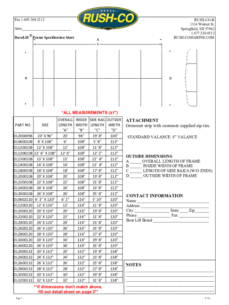 Fax 1.605.369.2112RUSHCO. 1314 Walnut St. Springfield, SD 57062 1.877.330.0512 RUSHCOMARINE.COM Attn:___ DuraLiftFrame Specification Sheet×ALL MEASUREMENTS (1\”) PART NO.SIZEDL2000096 20\' X 96\”