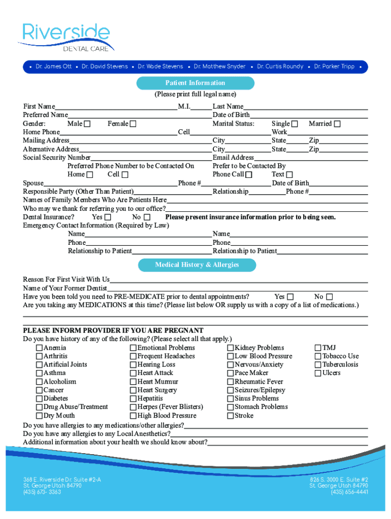 Dr. James Otter. David Stevens Dr. Wade Stevens Dr. Matthew Snyder Dr. Curtis Rounded. Parker TrippPatient Information (Please print full legal name) First Name M.I. Last Name Preferred Name Date