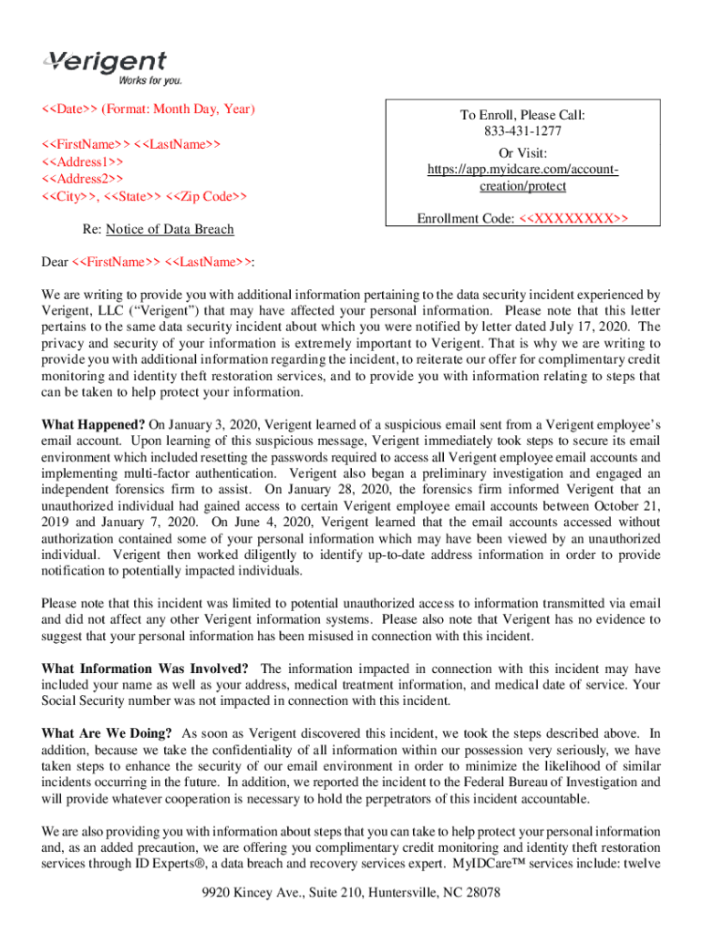 Get the free Verigent LLC - VT Follow-Up Consumer Notification Letter (Adult Non-SSN) - RH Edits ...