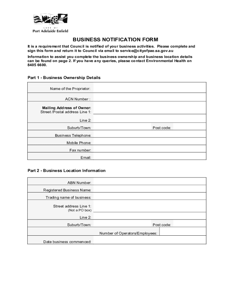 BUSINESS NOTIFICATION FORM It is a requirement that Council is notified of your business activities. Please complete and sign this form and return it to Council via email to service@cityofpae.sa.gov.au