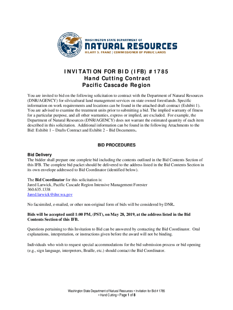 INVITATION FOR BID (IF) #1785 Hand Cutting Contract Pacific Cascade Region You are invited to bid on the following solicitation to contract with the Department of Natural Resources (DNR/AGENCY) for
