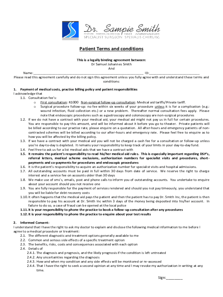 Patient Terms and conditions This is a legally binding agreement between: Dr Samuel Johannes Smith And Name:___ ID:___ Please read this agreement carefully and do not sign this agreement unless you