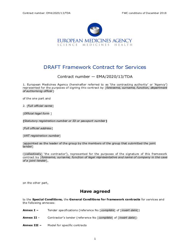 Contract number: EMA/2020/13/TRAFFIC conditions of December 2018DRAFT Framework Contract for Services Contract number EMA/2020/13/TDA 1. European Medicines Agency (hereinafter referred to as the contracting