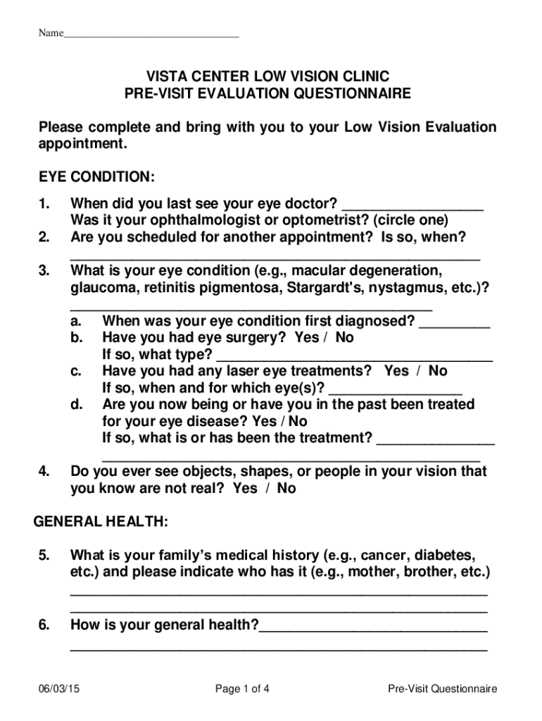 Name___VISTA CENTER LOW VISION CLINIC REVISIT EVALUATION QUESTIONNAIRE Please complete and bring with you to your Low Vision Evaluation appointment. EYE CONDITION: 1. 2. 3.4. When did you last see