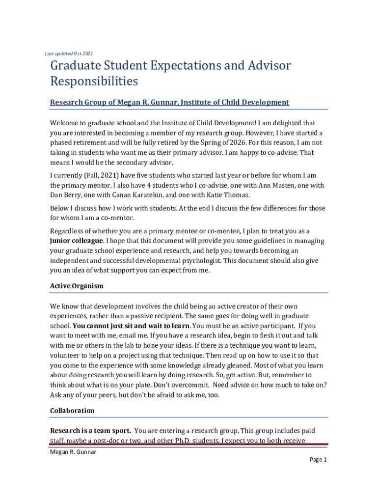 Last updated Oct 2021Graduate Student Expectations and AdvisorResponsibilitiesResearch Group of Megan R. Gunnar, Institute of Child DevelopmentWelcome to graduate school and the Institute of Child Development! I am delighted that