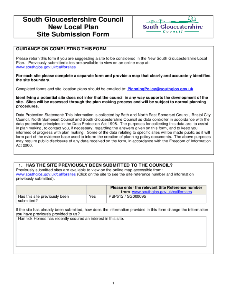 South Gloucestershire Council New Local Plan Site Submission Form GUIDANCE ON COMPLETING THIS FORM Please return this form if you are suggesting a site to be considered in the New South Gloucestershire
