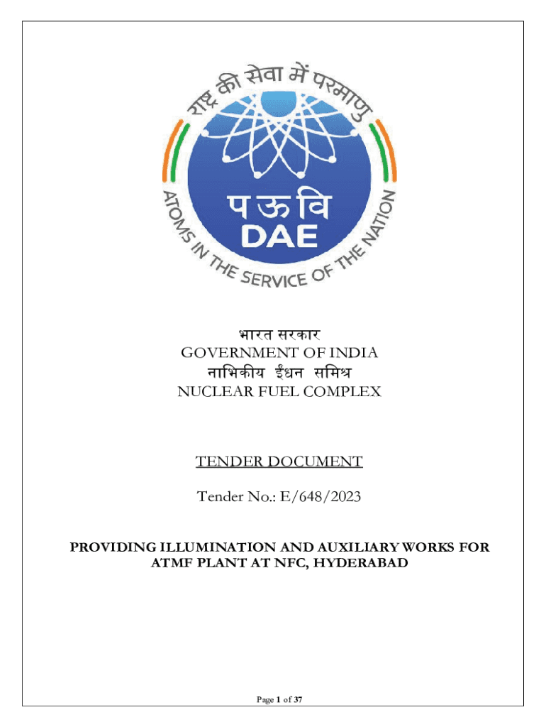 GOVERNMENT OF INDIA NUCLEAR FUEL COMPLEXTENDER DOCUMENT Tender No.: E/648/2023 PROVIDING ILLUMINATION AND AUXILIARY WORKS FOR ATM PLANT AT NFC, HYDERABADPage 1 of 37GOVERNMENT OF INDIA DEPARTMENT