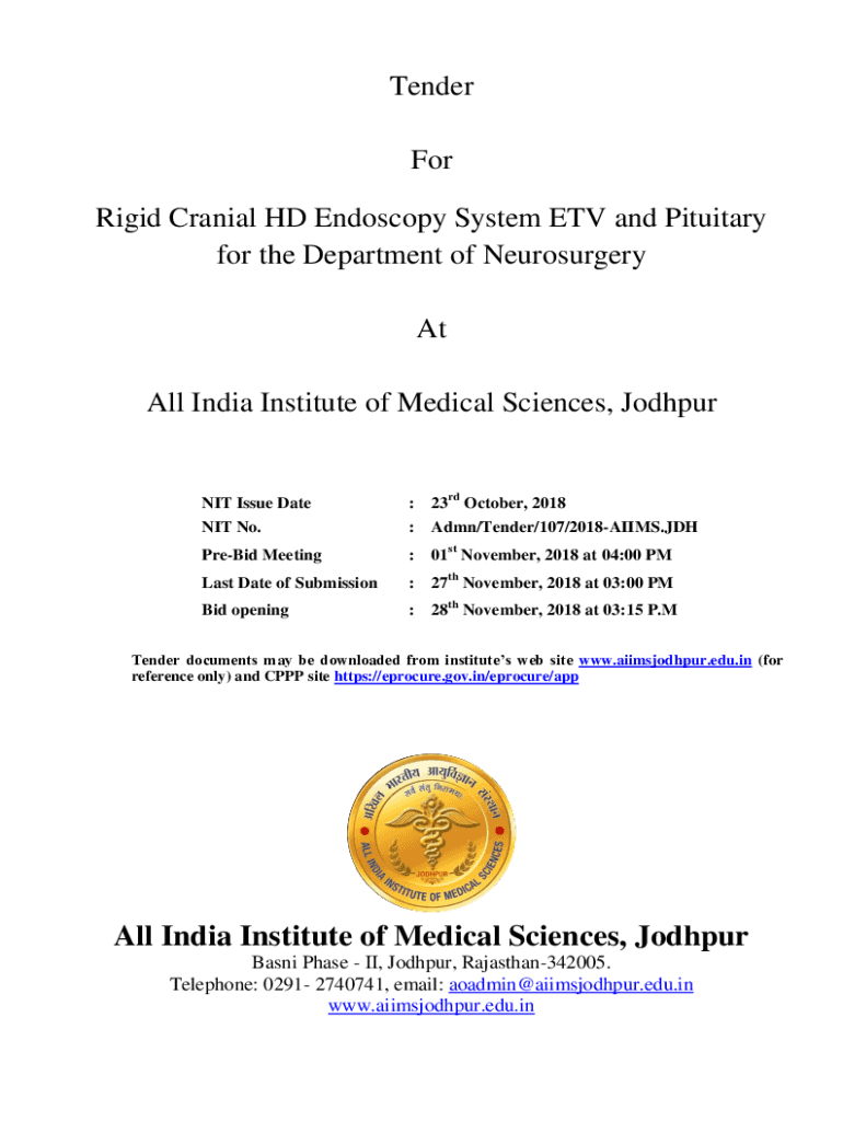Tender For Rigid Cranial HD Endoscopy System ETV and Pituitary for the Department of Neurosurgery At All India Institute of Medical Sciences, Jodhpurs Issue Date:23rd October, 2018NIT No.:Aden/Tender/107/2018AIIMS.Prebid